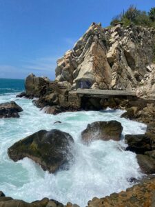 Leider konnten wir doch nicht surfen gehen… Unser Surflehrer Juan hat uns kurzfristig abgesagt ); Aber wir machen natürlich das beste daraus. Wir beschlossen, einen neuen Strand erkunden zu gehen. Eigentlich wollten wir an den Beach „Playa Manzanillo“, doch auf dem Weg dahin sind wir falsch abgebogen. Halb so schlimm, der Weg ist ja bekanntlich das Ziel. Felix und ich hatten einen wunderschönen Spaziergang durch Klippen und folgten dem Weg zum „Playa Prinzipal“. Ich bin immer wieder beeindruckt von der Kraft des Ozeans. Die Wellen brechen unwiderruflich an die Steine. Der Weg war auf halbem Weg abgebrochen, weshalb wir überlegten zurück zu gehen und eine andere Route zu nehmen, doch waren wir schon zu lange unterwegs um alles wieder an den Anfang zu gehen, weshalb wir uns entschieden zu klettern. Die Leute vor uns, versicherten, dass es machbar sei. Auf dem kurzen Abenteuer haben wir einige Krebse erspäht. Ein paar Fotos später erreichten wir den Strand. Er war nicht gross überlaufen, doch hatte es viel Müll rumliegen, was mich doch sehr störte. Das baden war also begrenzt angenehm.