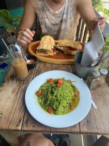 Um etwa 13:15 sind wir dann los vom Hundeheim um selbst Mittag essen zu gehen. Dieses Mal sind wir gleich beim Shelter Richtung Strand gelaufen, um zu gucken, ob es da was hübsches gibt. In der Tat, wir fanden ein süsses, kleines Restaurant in Richtung Strand wo wir assen. Felix mampfte ein Baguette und ich Pesto-Pasta im Zucchini Style. Sein Brot war sehr lecker! Meine Pasta leider überhaupt nicht… Zeitgleich wollte ich noch den Ausflug für Morgen organisieren. Was sich etwas mühsam gestaltete. Morgen gehen wir schnorcheln und sie teilten uns mit, dass wir mindesten 4 Leute sein müssen, um zu reservieren. Wir fragten also die Australier, ob sie auch Lust haben. Zum Glück haben sie das! Erst waren sie zu 5. Ich wollte aber nicht für Alle reservieren, da man gleich bezahlen musste… Auf keinen Fall würde ich für 7 Leute, für mehr als 400 Franken buchen, wenn ich die gar nicht richtig kenne. Zusätzlich habe ich Felix die andere Tour schon vorgeschossen und das war mir einfach zu heikel. Schlussendes waren sie dann doch nur noch 3 und Arthur hat mir das Geld gleich im voraus geschickt, weshalb ich dann trotzdem für Alle gebucht habe. Morgen um 9:00 Uhr gehts los nach „Huatalca“ auf den Boots-Trip!