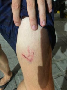 Nach dem Einkauf waren wir alle zusammen beim Shelter. Erst war es sehr ruhig und dann fingen die Hunde etwas an zu bellen. Chris kam ebenfalls vorbei, also schickte ich sie mit ein paar Vier Beinern an den Strand. Sie haben es alle sehr genossen. Als sie unterwegs waren, habe ich alle „Problem Hunde“ angeleint, dass sie ja nicht in ernsthafter Gefahr sind. Viele Hunde sind sehr hibellig mit neuen Leuten, schnappen und springen hoch. Es ist wichtig, dass zu realisieren und sicherheitshalber die dann an einer Kette zu befestigen. Es gibt mehrere Räume und um in den Hauptraum zu können, ist das schon essentiell. Es brauchte eine Weile, bis sich die Hunde an die Menschen gewöhnen, sowie bei Felix und mir jetzt. Ich hab Chris reingebeten und Felix hat manche losgemacht, worüber ich nicht informiert wurde. Plötzlich passierte es und Estella kratzte, oder schnappte ihn. Wir sind nicht ganz sicher. Es hat ihm nicht weh getan und sofort haben wir die Wunde ausgewaschen.