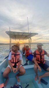 Un 6:40 Uhr wurden wir für unseren Delfin Trip abgeholt. Chris war pünktlich bei unserem Casa um abgeholt zu werden. Zu unserem Pech, waren sie sogar früher bei uns. Danach ging es ab zum Boot. Der Sonnenaufgang war wie immer märchenhaft. Leider merkten wir bereits nach 20 Minuten auf dem Boot, dass Fabio seekrank wurde. Der Ausflug würde schwer werden für ihn. Mehr als 2 Stunden Stichen wir mit dem kleinen Anglerboot ins Meer hinaus. Fabio musste sich leider ziemlich oft übergeben. Nach einer gefühlten Ewigkeit für ihn, sahen wir dann die Delfine. Mantarochen, sowie Schildkröten konnten wir auch erspähen. Die Wellen waren überraschend groß und die Delfin dafür eher klein.